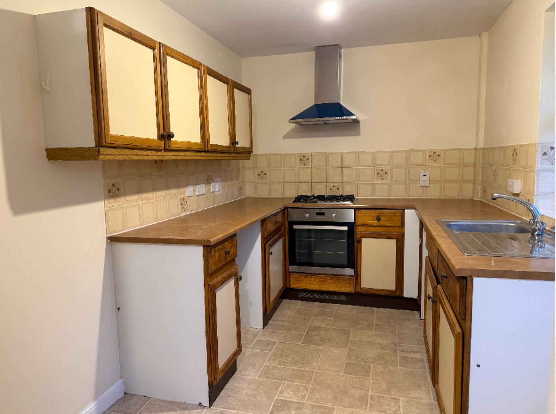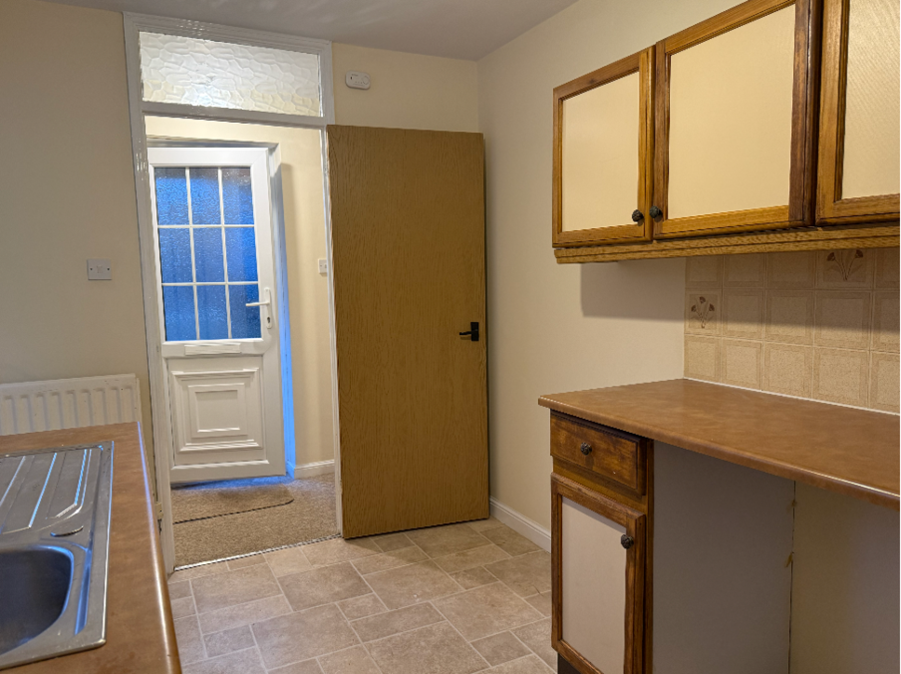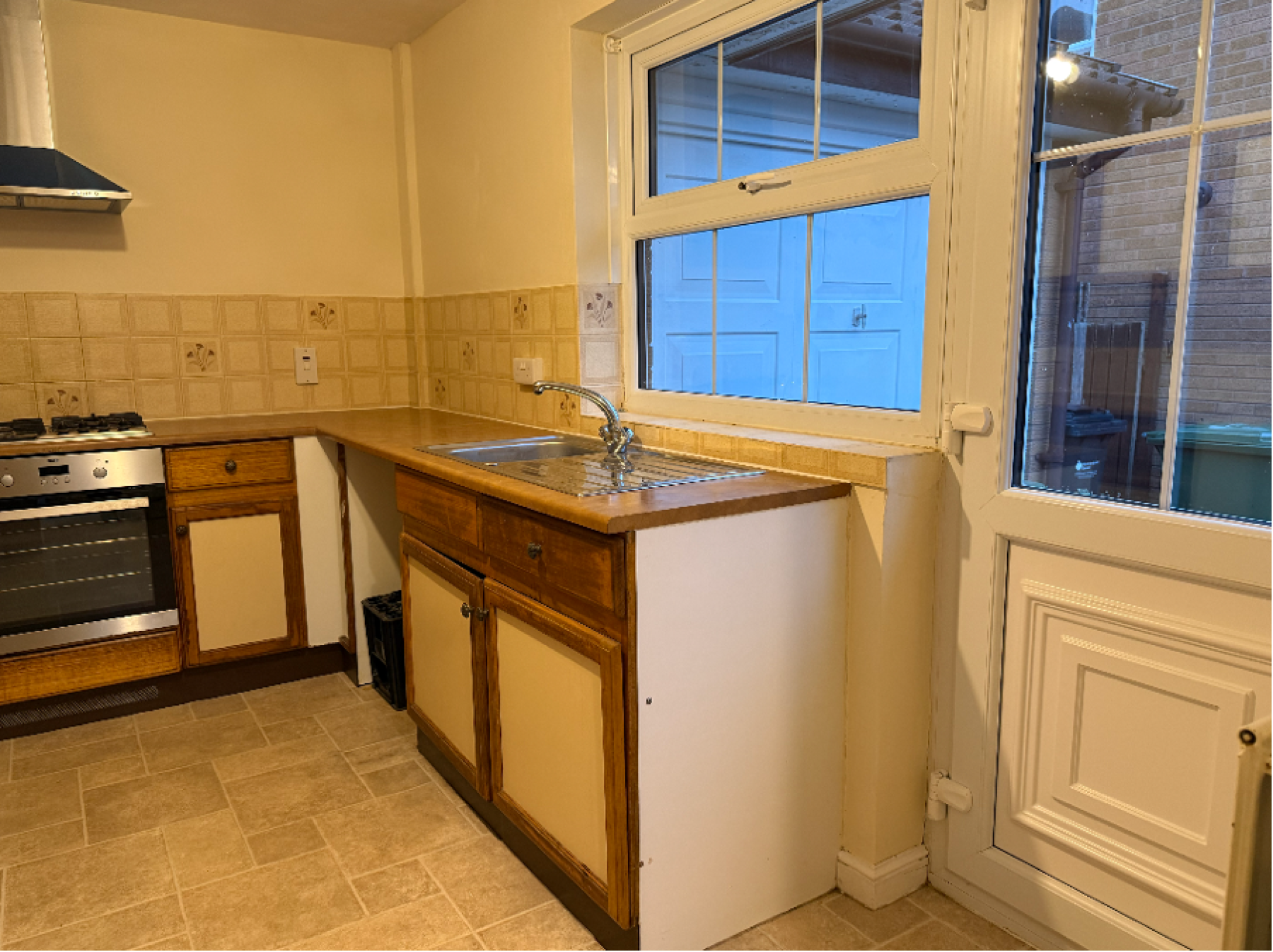 Kitchen – this is fitted with an electric hob and electric oven with spaces for a washing machine and fridge freezer. There is also access to the side of property and driveway.