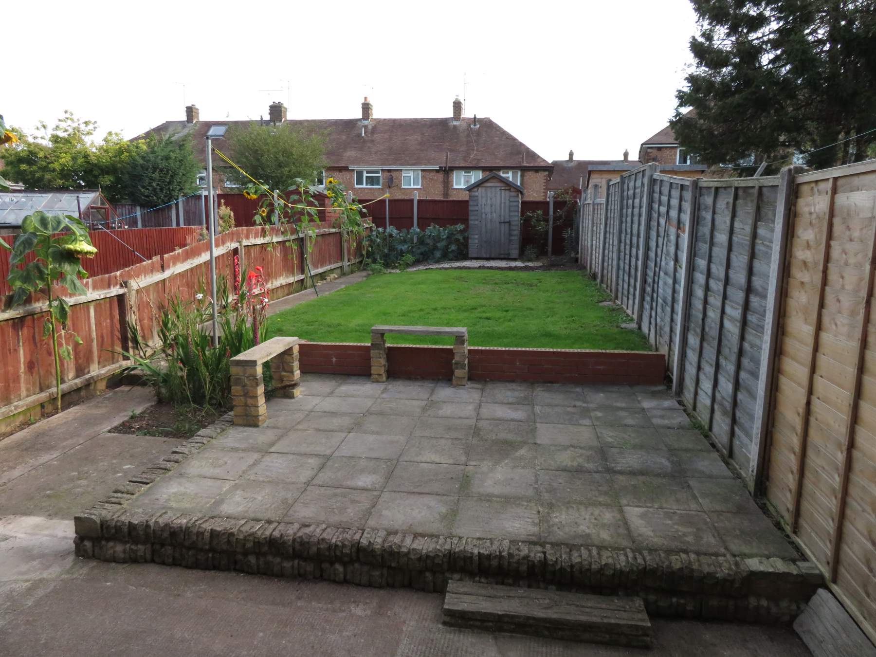The rear garden has a patio area and a large lawn area and also a shed.