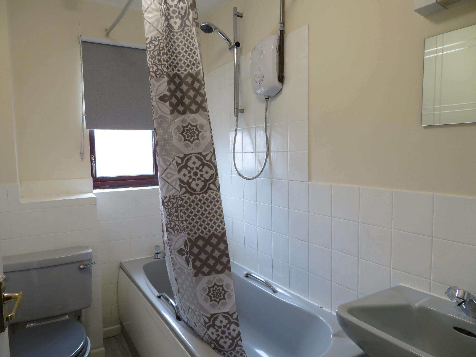 Wet room – The bathroom has a bath with an electric shower over.
